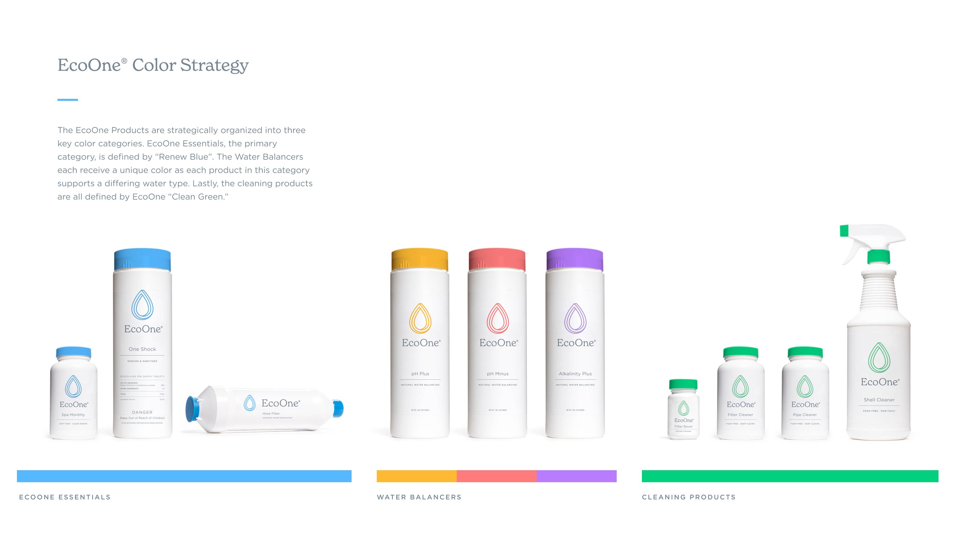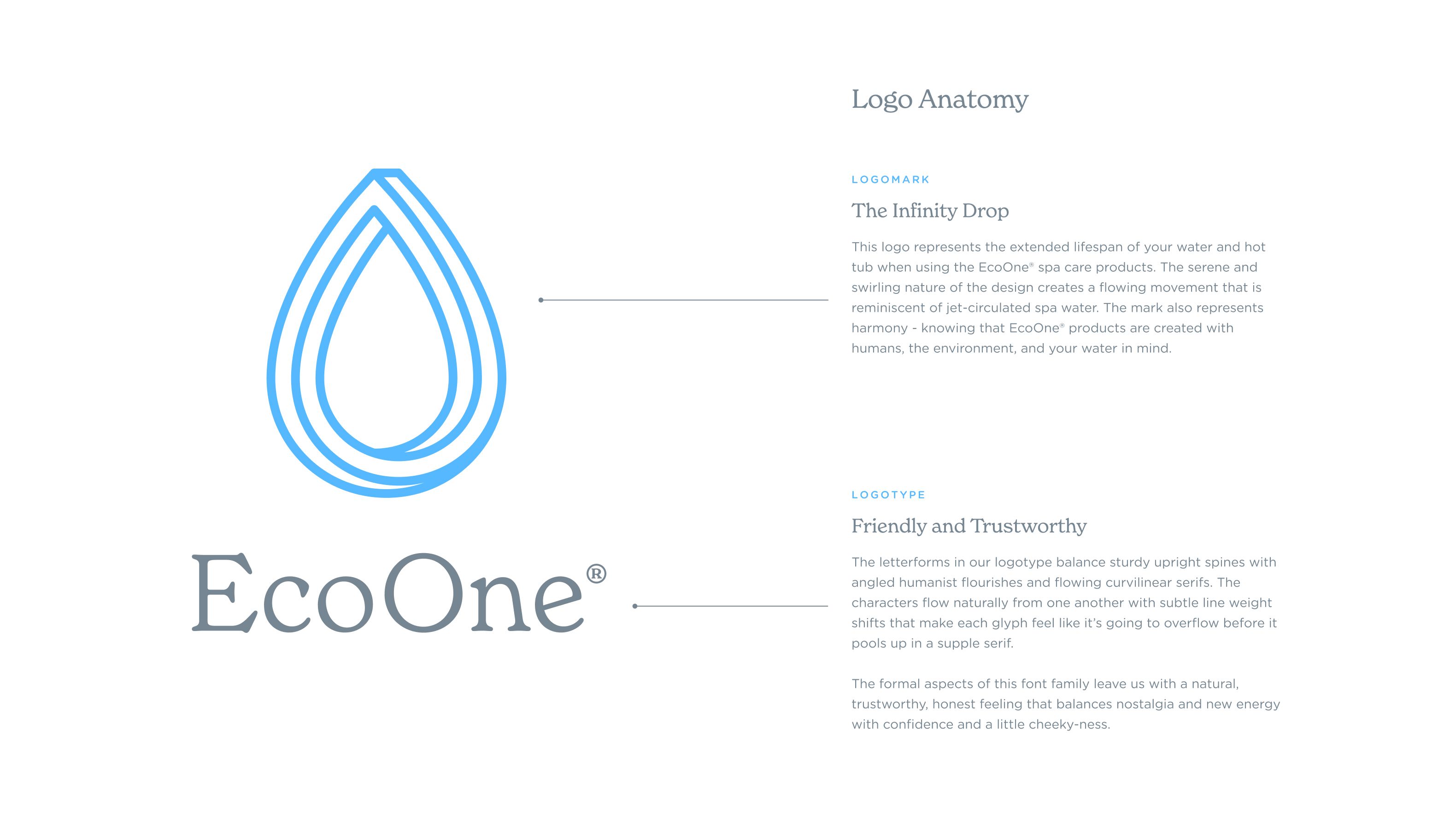Our consumer insights informed us that our target market identified with the core brand values of simple, safe for your skin and eco-friendly. The new logo mark represents the extended lifespan of your water and hot tub when using the EcoOne® spa care products. The serene and swirling nature of the design creates a flowing movement that is reminiscent of jet-circulated spa water. The mark also represents harmony - knowing that EcoOne® products are created with humans, the environment, and your water in mind.